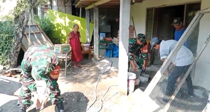 Babinsa setempat, Serka Joko bersama dengan beberapa anggota Koramil Karangmalang, bahu-membahu membantu proses perbaikan rumah. Mereka membantu mulai dari membersihkan puing-puing, mengangkut material bangunan, hingga membantu proses pemasangan dinding dan atap rumah.