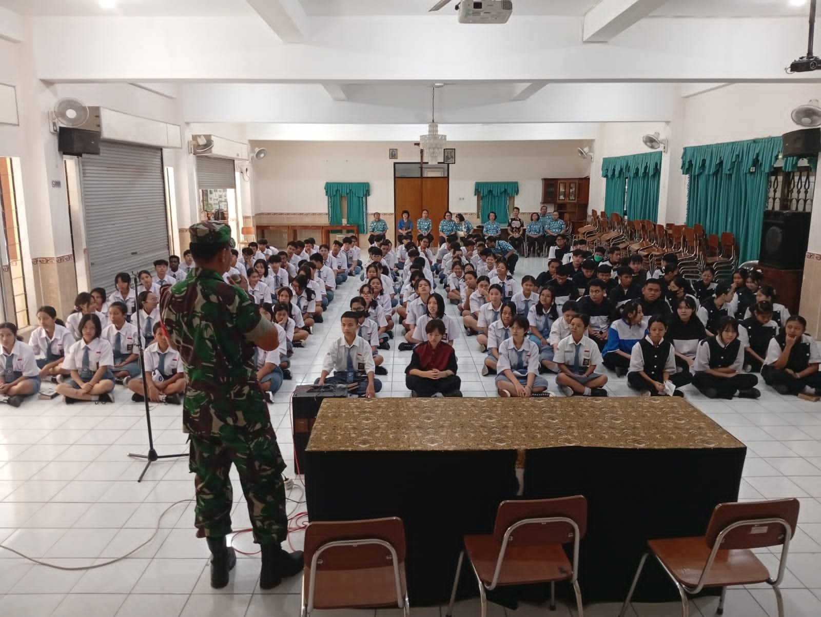 Metronusa News, Surakarta | Babinsa Kelurahan Punggawan Koramil 02/Banjarsari Kodim 0735/Surakarta Serka Junaidi melaksanakan kegiatan pembunaan ketahanan wilayah (Binwanmil) dengan memberikan materi wawasan kebangsaan kepada Siswa – Siswi SMK Marsudirini Surakarta bertempat di Aula sekolah Jl. Madyotaman No. 1 Kelurahan Punggawan Kecamatan Banjarsari, Selasa (28/10/2025).