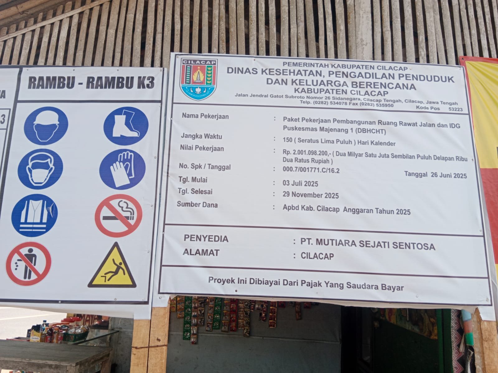Metronusa News, Cilacap | Pembangunan Ruang Rawat Jalan dan IGD Puskesmas Majenang 1 yang dikerjakan oleh PT.Mutiara Sejati Sentosa dengan Nilai Kontrak sebesar Rp.2.001.098.200 yang didanai melalui APBD Kabupaten Cilacap. Pelaksanaan dimulai dari Tanggal 03 Juli 2025 sampai dengan 29 November 2025.