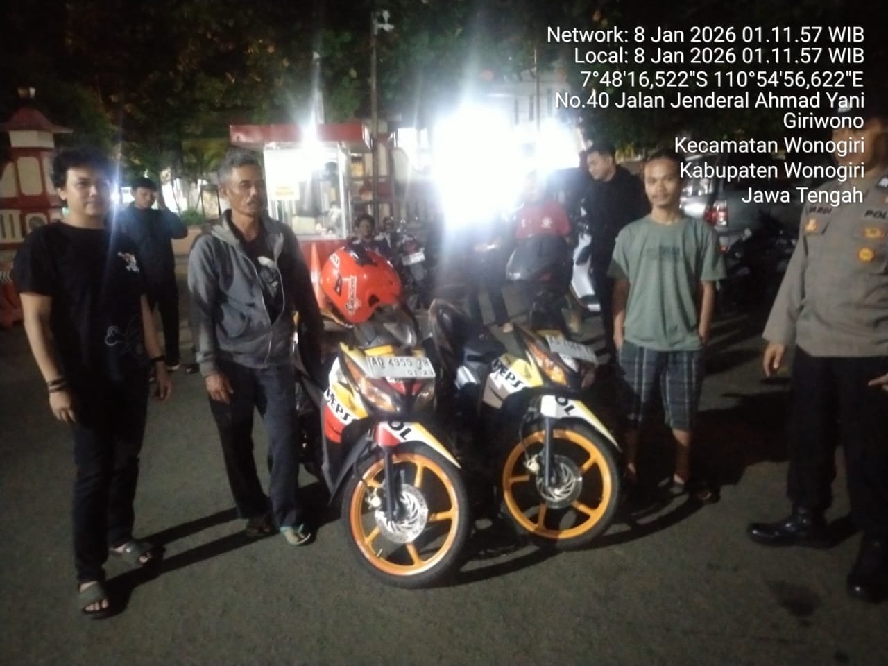Kapolres Wonogiri AKBP Wahyu Sulistyo, melalui Kasi Humas AKP Anom Prabowo, menjelaskan, Polisi menerima laporan pada pukul 23.30 WIB dan langsung ditindaklanjuti oleh Unit Reskrim dengan mendatangi lokasi kejadian. Dari hasil pengecekan di tempat kejadian perkara, petugas menemukan adanya sepeda motor serupa dengan nomor polisi berbeda yang terparkir berdekatan.
