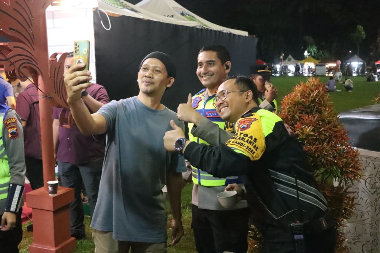 Aparat kepolisian tidak hanya hadir dengan pengamanan ketat, tetapi juga mengedepankan pendekatan humanis dengan menyapa langsung masyarakat.