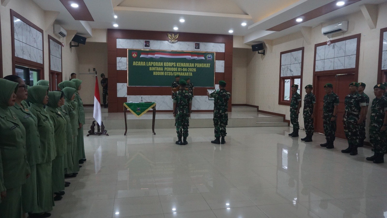 Metronusa News, Surakarta – Bertempat di Aula Dharmawangsa Komplek Kodim 0735/Surakarta Jln. A yani No. 349, Kelurahan Kerten Kecamatan Laweyan, dilaksanakan acara tradisi penerimaan prajurit dan korp raport kenaikan pangkat serta laporan pindah satuan dan Purna tugas, Rabu (01/04/2026).
