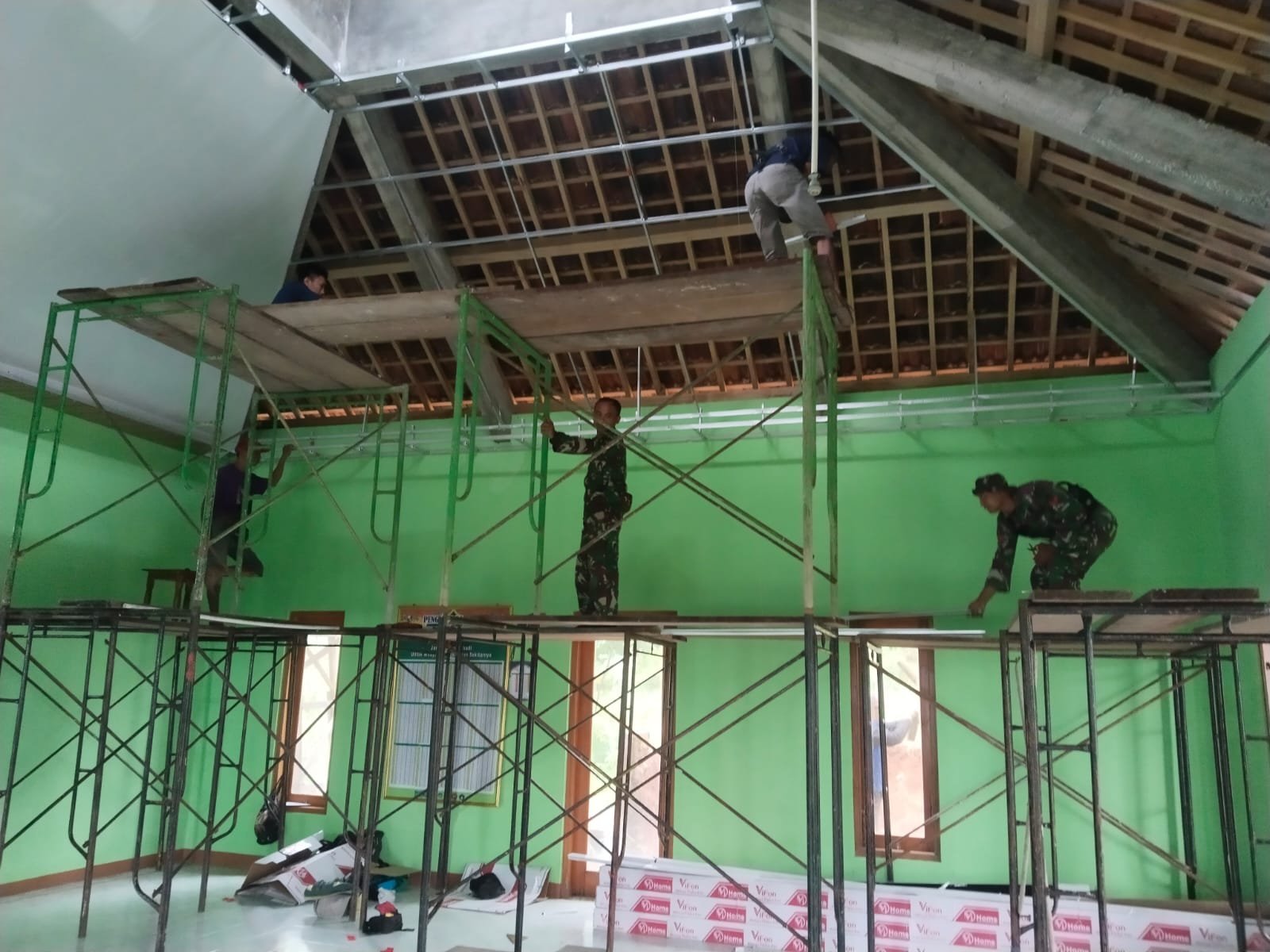 Saat ini, pengerjaan telah memasuki tahap perbaikan bagian dalam bangunan. Pembenahan meliputi plafon serta penataan interior agar kondisi Masjid semakin bersih, rapi, dan nyaman digunakan.