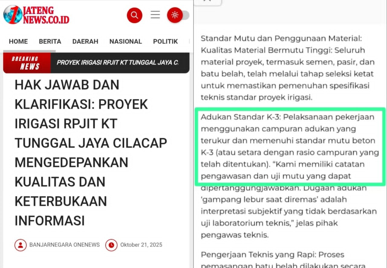 Diduga adanya Berita yang menyesatkan Publik dengan judul “Hak Jawab Resmi Kementerian dan Pelaksana Proyek Irigasi Cilacap : Tegaskan Komitmen Kwalitas dan Transparansi” tentu ini diduga menyesatkan Publik. Yang mana “Hak Jawab Resmi Kementerian” apakah betul yang memberikan hak jawab tersebut adalah Juru bicara Kementan yang memiliki Surat Keputusan Resmi Sebagai Pegawai Negeri Sipil yang memiliki Jabatan Kepala Biro Hubungan Masyarakat dan Informasi Publik Kementerian Pertanian. Kita berharap penulis berita dapat menunjukan surat resmi dari Kementan bahwa statemen itu resmi.