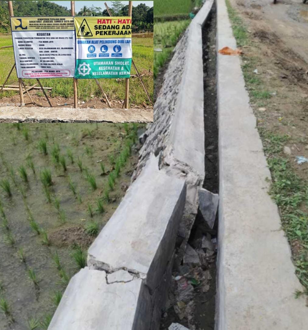 Proyek yang dikerjakan secara swakelola oleh Kelompok Petani Pengguna Air (P3A) Manik Jaya dengan nomor kontrak PKS HK.02.03/67/PKS/Az.05.3/VIII/2025 itu diduga mengalami kegagalan konstruksi akibat pelaksanaan yang dinilai asal-asalan dan tidak sesuai spesifikasi teknis.