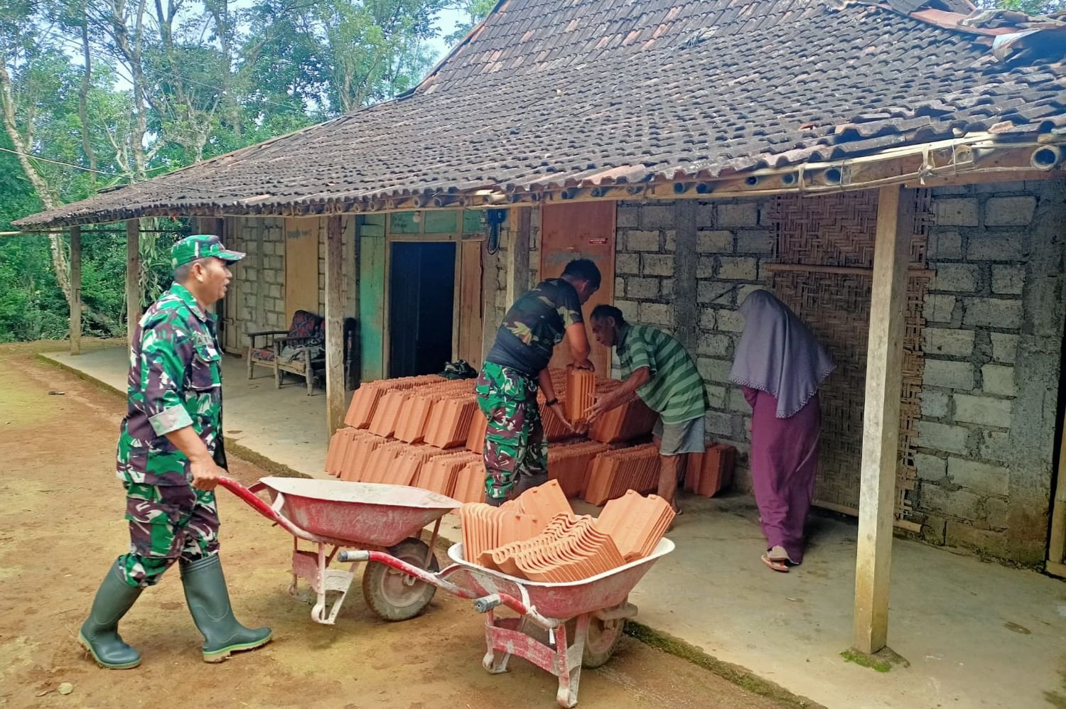 Material genteng mulai didatangkan ke lokasi, dan proses bongkar muat dilakukan secara gotong royong oleh personel Satgas TMMD bersama masyarakat menggunakan angkong.