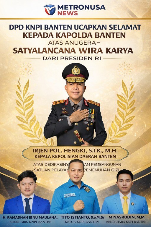 Metronusa News | Banten — Presiden Republik Indonesia, Prabowo Subianto, menganugerahkan tanda kehormatan Satyalancana Wira Karya kepada Kapolda Banten, Irjen. Pol. Hengki, S.I.K., M.H., dalam seremoni kenegaraan yang digelar di Jakarta, Jumat (13/2/2026).