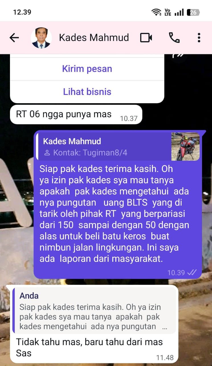 Respons Kepala Desa dan Sikap Bungkam Ketua RT, Awak media mencoba melakukan konfirmasi langsung kepada Kepala Desa Kamulyan, Mahmud, melalui pesan singkat WhatsApp untuk menanyakan apakah pihak desa mengetahui kebijakan tarikan dana tersebut. Kades Mahmud memberikan jawaban singkat:
