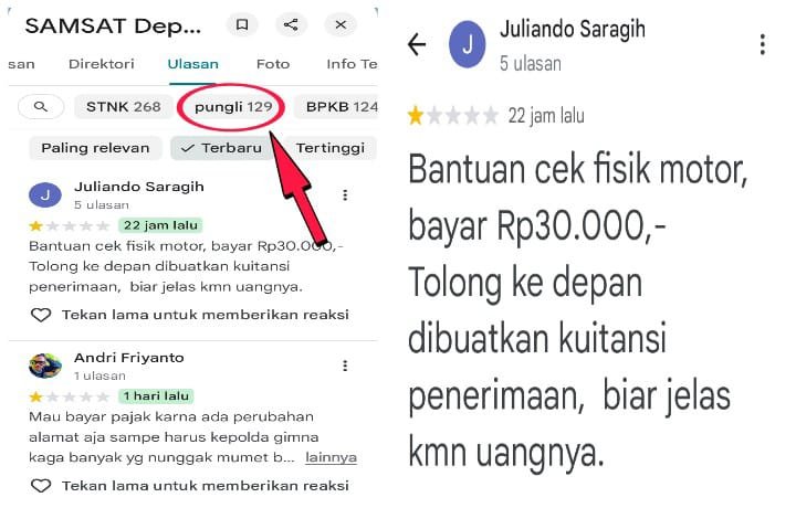 Metronusa News, Depok, Jawa Barat | Dugaan praktik pungutan liar (pungli) di kantor Samsat Depok kembali mencuat. Dari total 129 ulasan pengguna Google Maps, banyak di antaranya yang mengeluhkan adanya pungutan tak resmi saat proses pelayanan, khususnya saat cek fisik kendaraan bermotor.