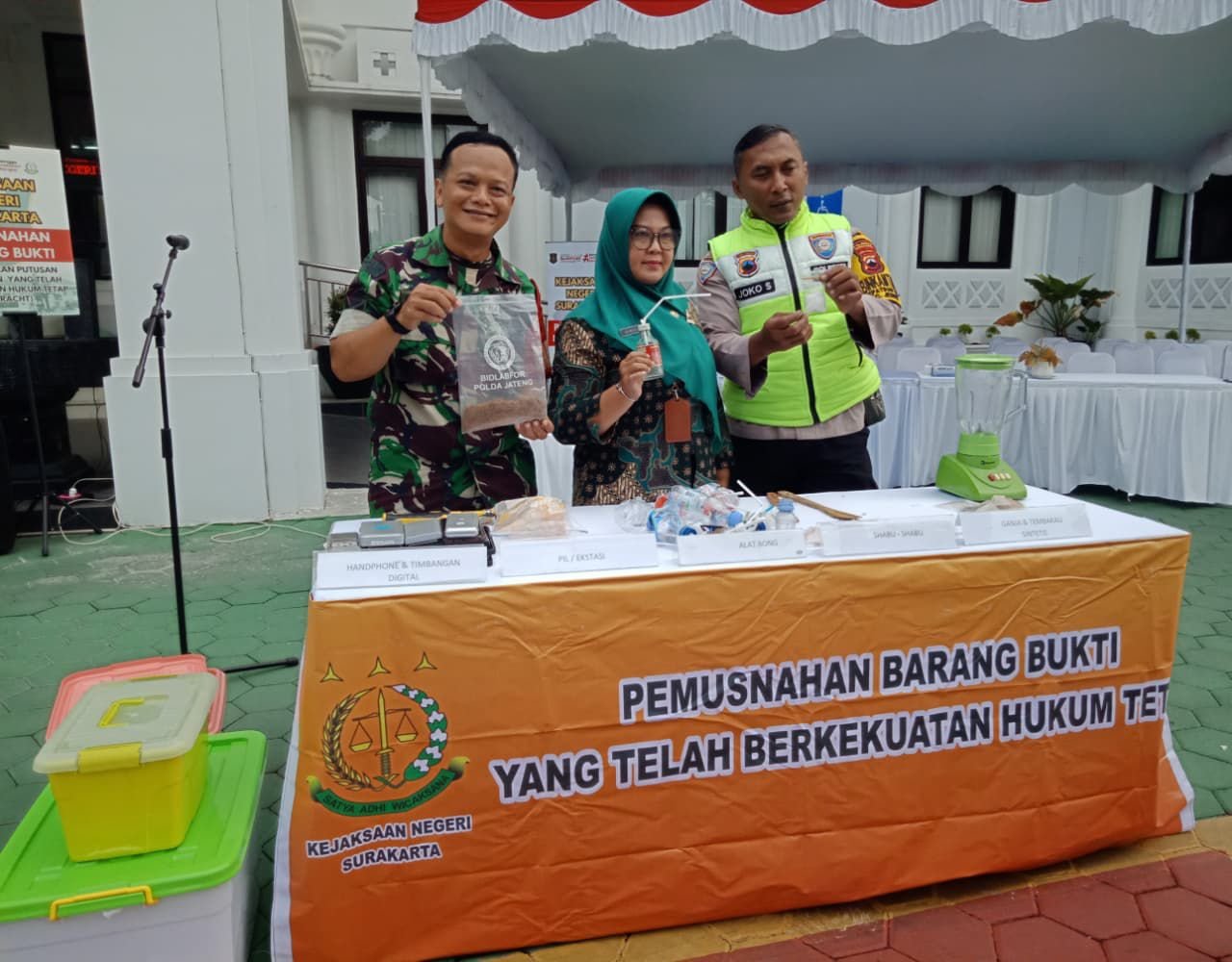 Kegiatan ini dihadiri oleh unsur Kejari Kota Surakarta, perwakilan TNI – Polri, aparat penegak hukum, serta instansi terkait lainnya. Pemusnahan barang bukti ini merupakan bentuk komitmen aparat hukum dalam menegakkan aturan dan menjaga keamanan masyarakat dari peredaran barang terlarang.