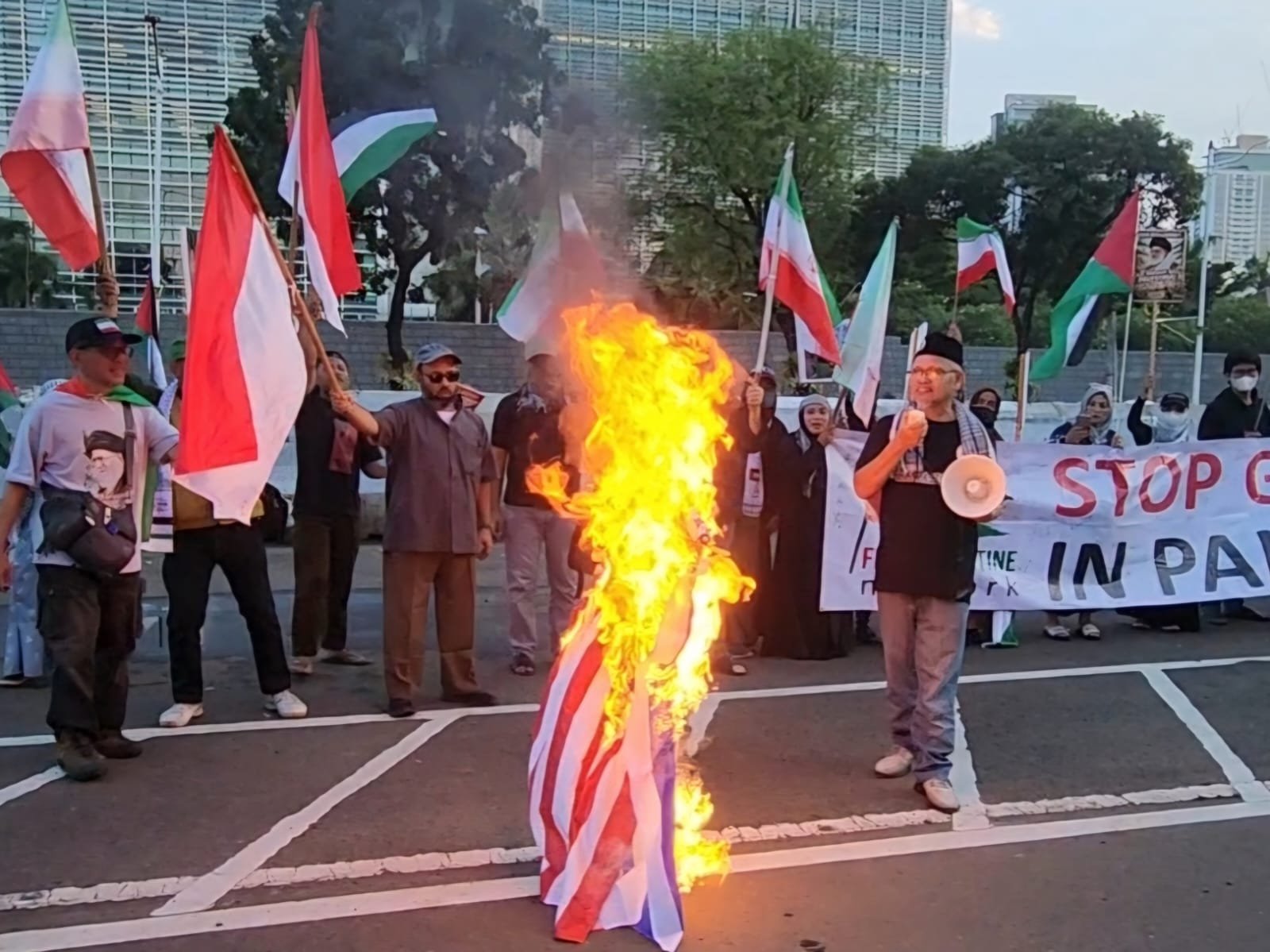 Di Jakarta aksi dipusatkan di depan kedutaan besar Amerika Serikat, Jalan Medan Merdeka, Jakarta Pusat. Selain membawa beragam poster, massa FPN membentangkan spanduk besar bertuliskan “Dukung Iran Lawan Israel-AS”.