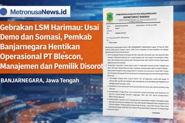 MetronusaNews.id | BANJARNEGARA, Jawa Tengah – Pemerintah Kabupaten Banjarnegara resmi menghentikan sementara operasional PT Superior Prima Sukses Tbk (Blescon) melalui surat Sekretariat Daerah Nomor 000/206/Setda/2026 tertanggal 26 Februari 2026. Surat tersebut merupakan jawaban atas somasi DPP LSM Harimau dan sekaligus menegaskan tanggung jawab hukum yang harus dipenuhi pihak perusahaan.
