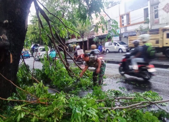 Metronusa News, Surakarta | Babinsa Kelurahan Manahan Koramil 02/Banjarsari Kodim 0735/Surakarta Serma Saring bersama dengan petugas DLH Kota Surakarta dan Anggota Linmas Kelurahan Manahan serta Warga Masyarakat mengevakuasi pohon tumbang yang diakibatkan hujan deras disertai angin kencang di Jl. A. Yani, Kelurahan Manahan Kecamatan Banjarsari, Jum’at (10/10/2025)