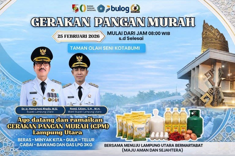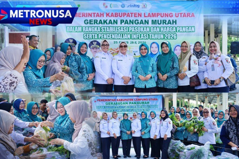 Metronusa News | Kotabumi – Pemerintah Kabupaten Lampung Utara menggelar kegiatan Gerakan Pangan Murah yang dipusatkan di Taman Olah Seni, Rabu (25/02/2026). Kegiatan pasar murah tersebut langsung diserbu masyarakat sejak pagi hari.