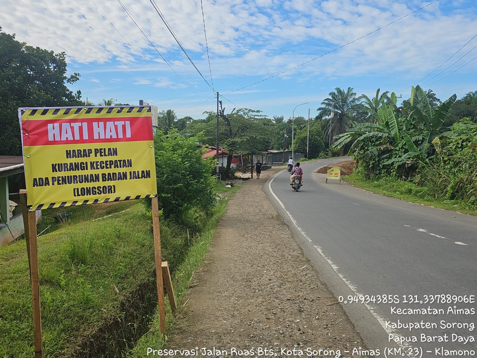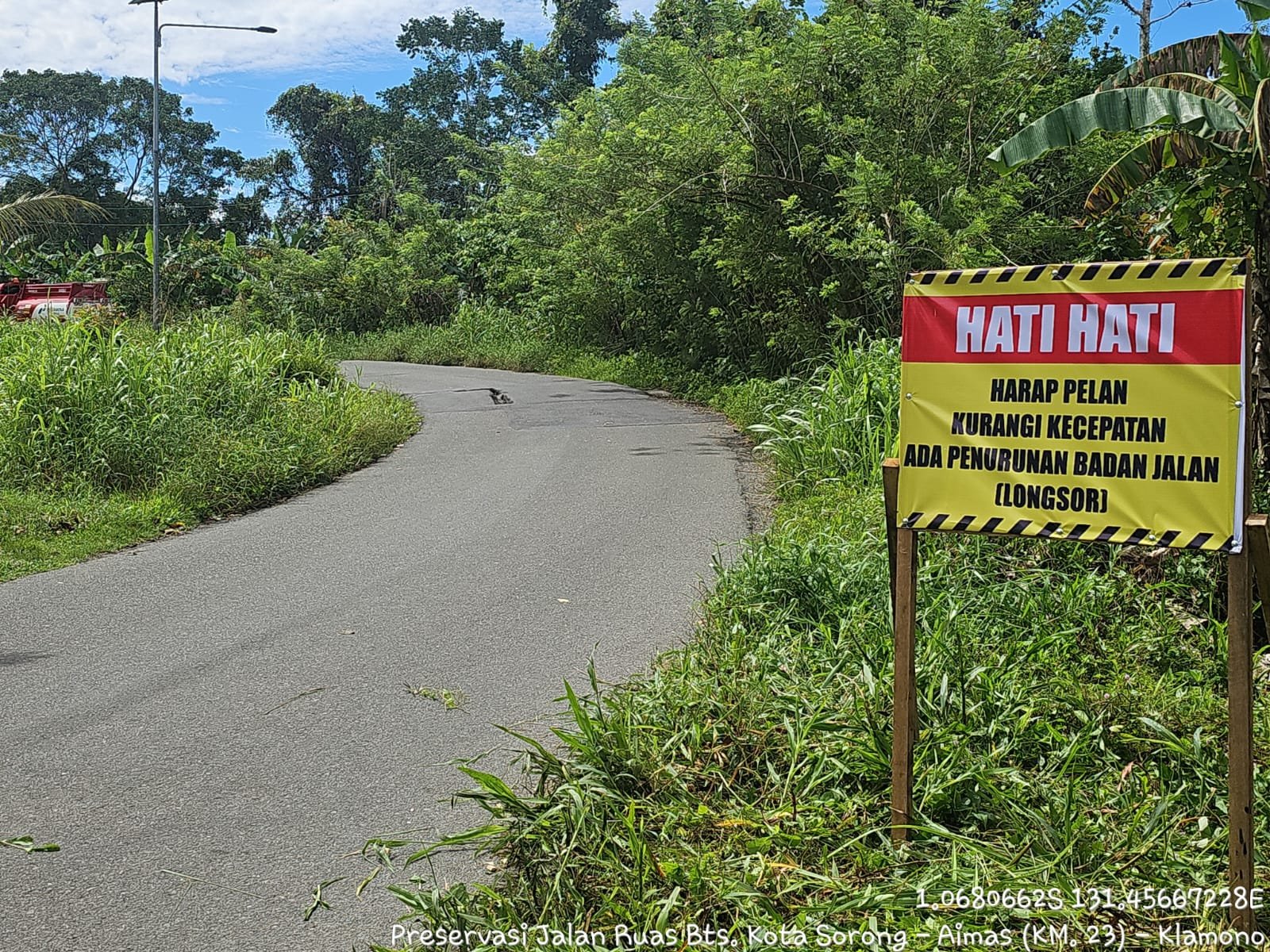 Sementara itu, Kepala Satuan Kerja PJN I Sorong, Wahyudi Afendi, ST., MT., menjelaskan bahwa pemasangan rambu peringatan di titik-titik longsor merupakan langkah pencegahan sementara.