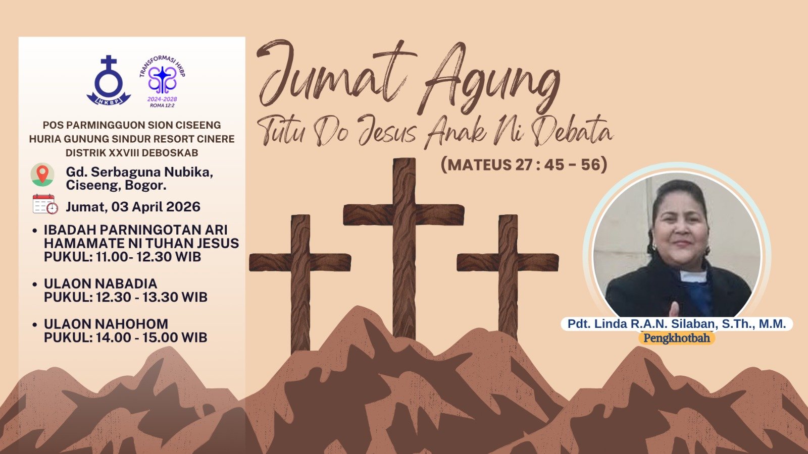 MetronusaNews.id | BOGOR – Umat Kristiani di wilayah Ciseeng dan sekitarnya akan memperingati Jumat Agung melalui rangkaian ibadah yang digelar oleh HKBP Sion Ciseeng, Huria Gunung Sindur Resort Cinere, pada Jumat, 3 April 2026.