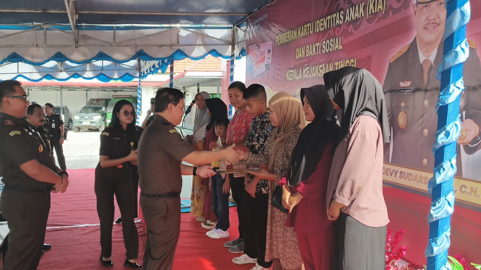 Rangkaian kegiatan berikutnya dilanjutkan dengan Bakti Sosial yang dilaksanakan di halaman kantor Kejari Natuna, diantaranya Pemberian Kartu Identitas Anak (KIA) sebanyak 20 anak, penyerahan Penetapan Perwalian kepada 4 orang anak dan pemberian tali asih berupa sembako kepada 50 keluarga, turut hadir dalam kegiatan tersebut Kadis Dukcapil dan Kadis Sosial Kab. Natuna.