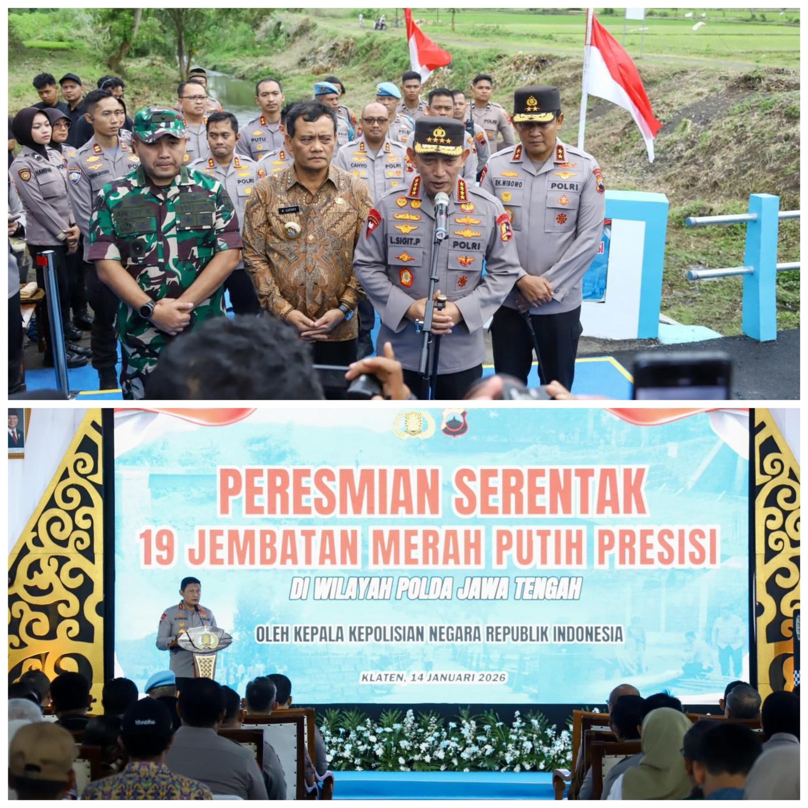 Metronusa News, Klaten, Jawa Tengah | Kapolri Jenderal Polisi Listyo Sigit Prabowo meresmikan secara serentak 19 Jembatan Merah Putih Presisi yang telah selesai dibangun di berbagai wilayah Jawa Tengah, Rabu (14/1/2026). Peresmian dipusatkan di Jembatan Merah Putih Presisi yang menghubungkan Desa Cucukan dan Desa Kotesan, Kecamatan Prambanan, Kabupaten Klaten.