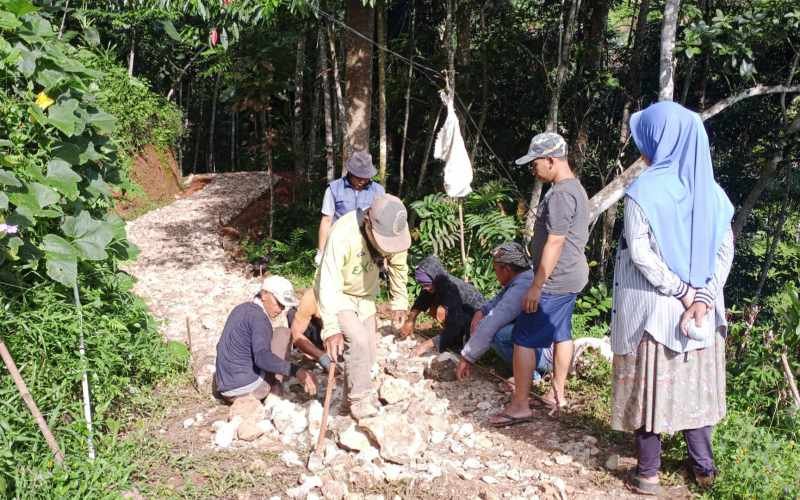 Warga Kampung Rancah sedang membangun jalan pemasangan batu