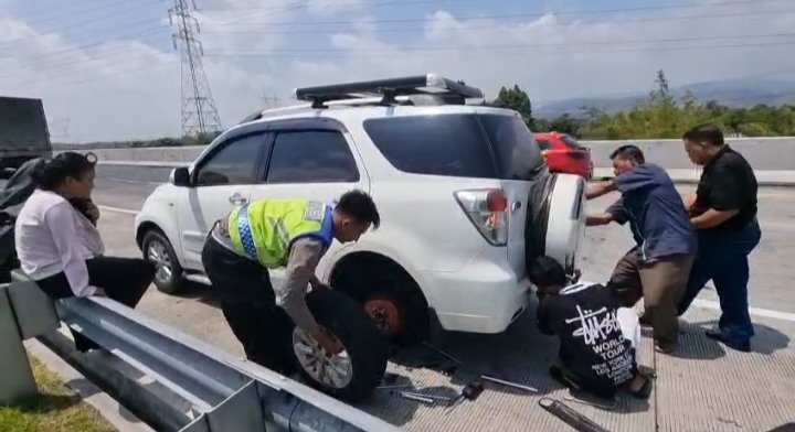 Di wilayah Polres Kendal, Patroli Satgasres Kamseltibcarlantas OKC 2026 membantu pengendara yang mengalami pecah ban di KM 387 A saat dalam perjalanan mudik menuju Madura. Petugas segera memberikan bantuan agar kendaraan dapat kembali melanjutkan perjalanan dengan aman.