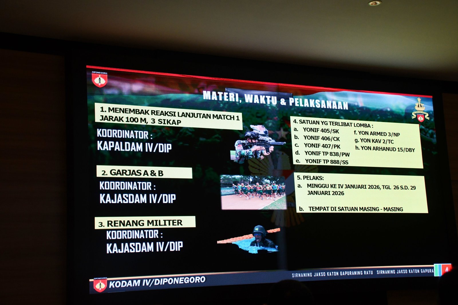 Kesiapan Lomba dipaparkan oleh Asisten Operasi kepada Pangdam IV/Diponegoro Mayjen TNI Achiruddin, S.E., M.Han., bertempat di Ruang Bina Yudha, Makodam, Rabu (14/1/2026).