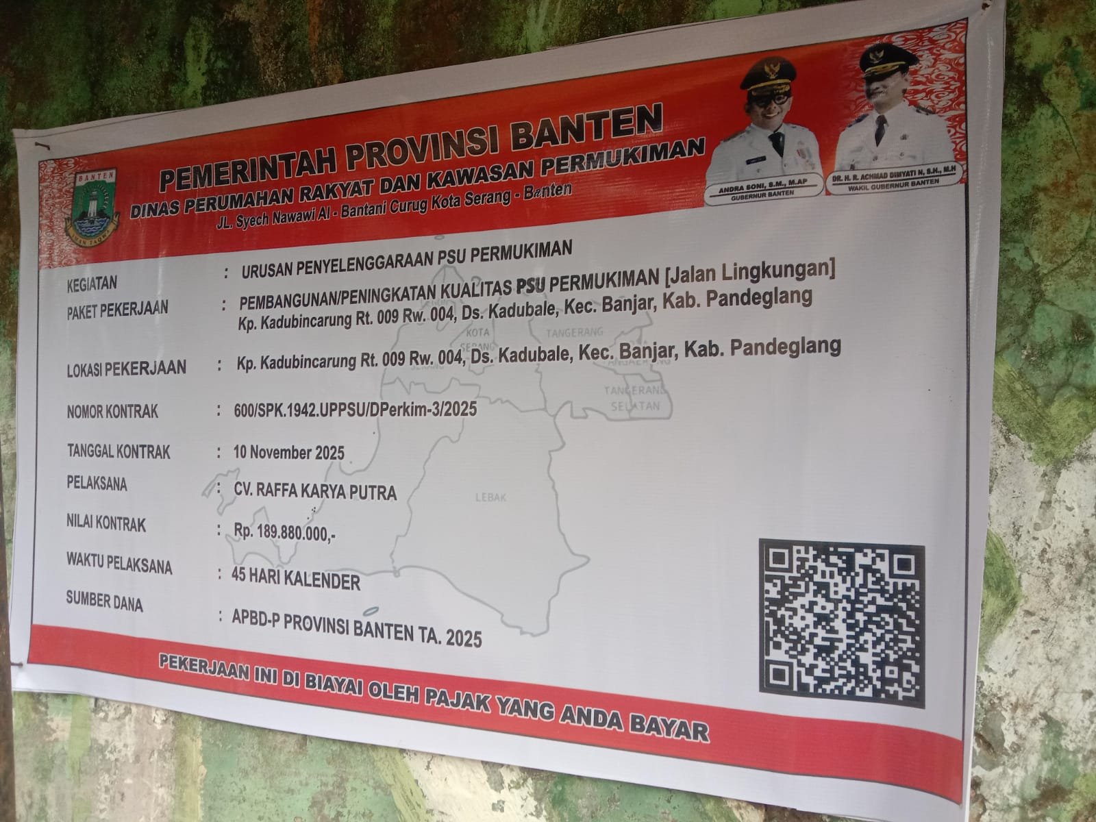 Mengacu pada papan informasi proyek, pekerjaan ini merupakan Pembangunan/Peningkatan Kualitas PSU Permukiman (Jalan Lingkungan) yang dilaksanakan oleh CV. Raffa Karya Putra dengan nilai kontrak Rp189.880.000. Proyek tersebut memiliki waktu pelaksanaan 45 hari kalender berdasarkan Kontrak Nomor 600/SPK.1942.UPPSU/DPerkim-3/2025 tertanggal 10 November 2025, serta bersumber dari APBD-P Provinsi Banten Tahun Anggaran 2025.