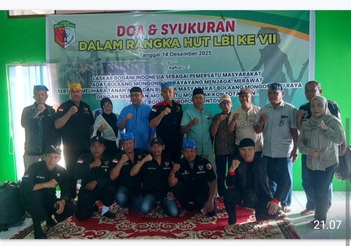 Metronusa News, Kotamobagu | Laskar Bogani Indonesia (LBI) merayakan hari jadi ke-7 pada tanggal 14 Desember 2025. Organisasi masyarakat adat ini berdiri pada tanggal 14 Desember 2018 di Kotamobagu, Sulawesi Utara. Ketua Umum LBI, Drs. Dolfi Paat, memimpin acara syukuran yang diadakan di Markas Sekretariat LBI Kotamobagu.