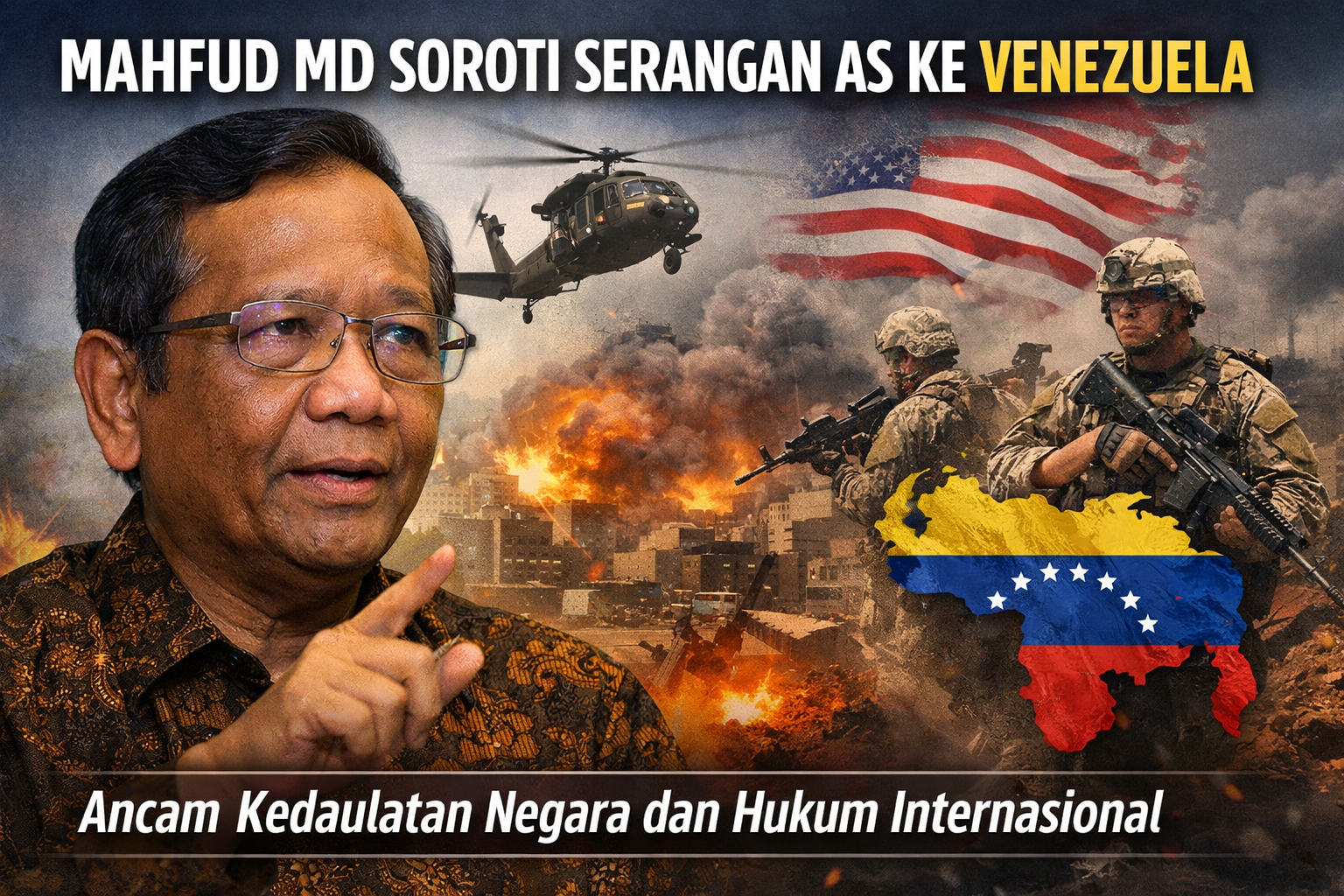 Metronusa News, Jakarta — Mantan Menteri Koordinator Bidang Politik, Hukum, dan Keamanan (Menko Polhukam) RI, Mahfud MD, memberikan pandangannya terkait aksi militer Amerika Serikat (AS) terhadap Venezuela yang memicu ketegangan internasional. Mahfud menilai tindakan tersebut berpotensi melanggar prinsip kedaulatan negara dan merusak tatanan hukum internasional.