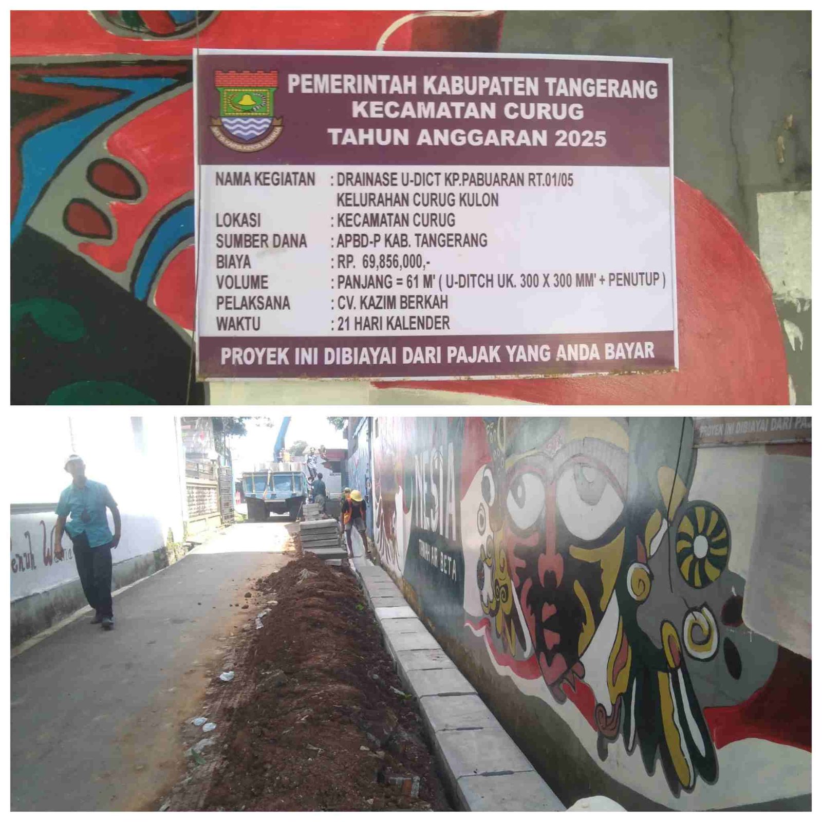 Jurek nama sapaan sang pengawas di lapangan menjelaskan ke Awak media terkait pembangunan saluran air ini di biayai oleh APBD- Kabupaten Tangerang, adapun volume U-Ditch di sini panjang 61 meter