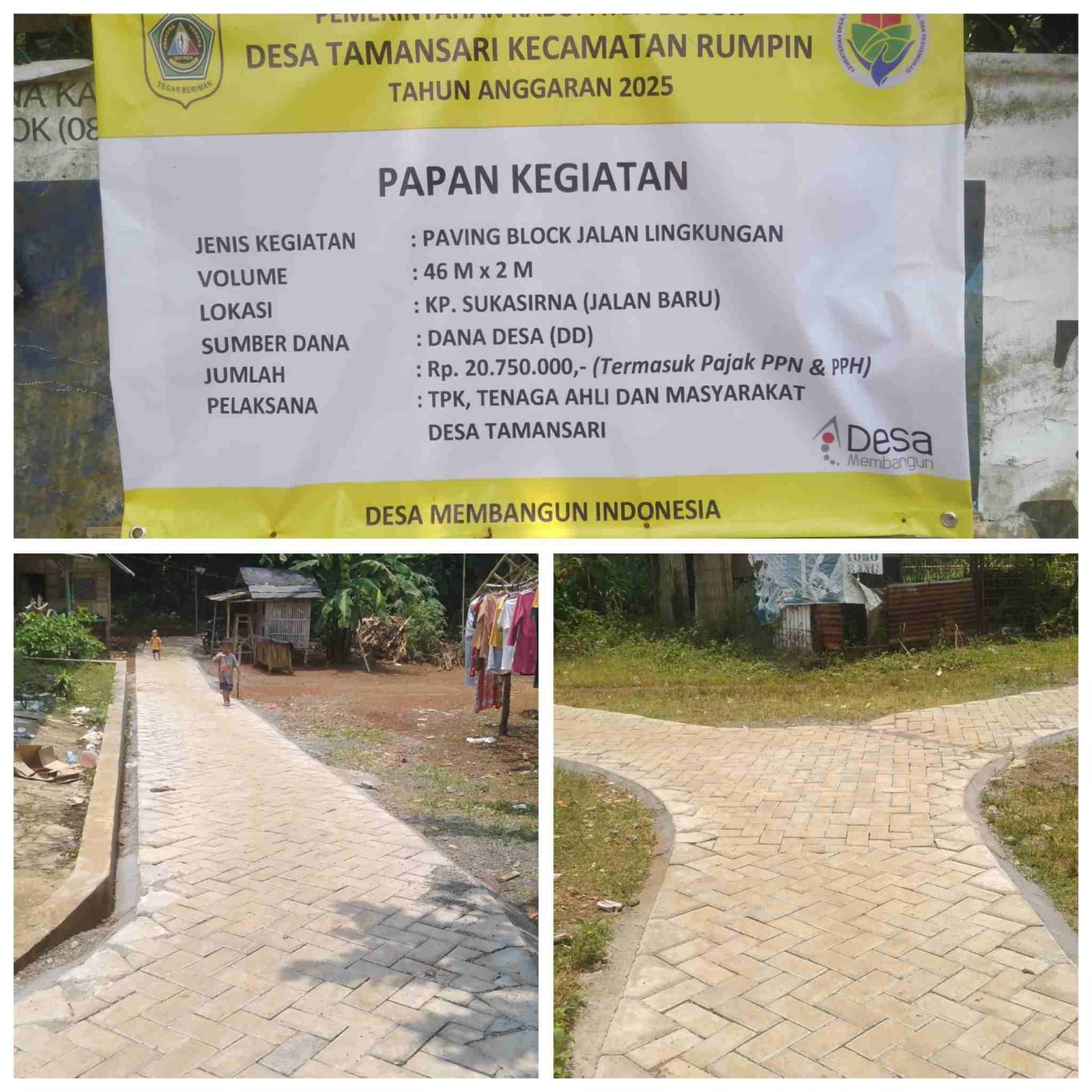 Pengerjaan jalan lingkungan pemasangan Paving Block di kampung Suka sirna Rt. 001.Rw.008. ini menggunakan tenaga ahli dan masyarakat di sekitar adapun untuk Volume 46 Meter x 2. Meter dengan biaya sebesar Rp.20.750.000 ( Dua Puluh Juta Tujuh Ratus lima puluh Ribu Rupiah ) untuk sumber dana pembangunan menggunakan Dana Desa ( DD ) Anggaran Tahun 2025.
