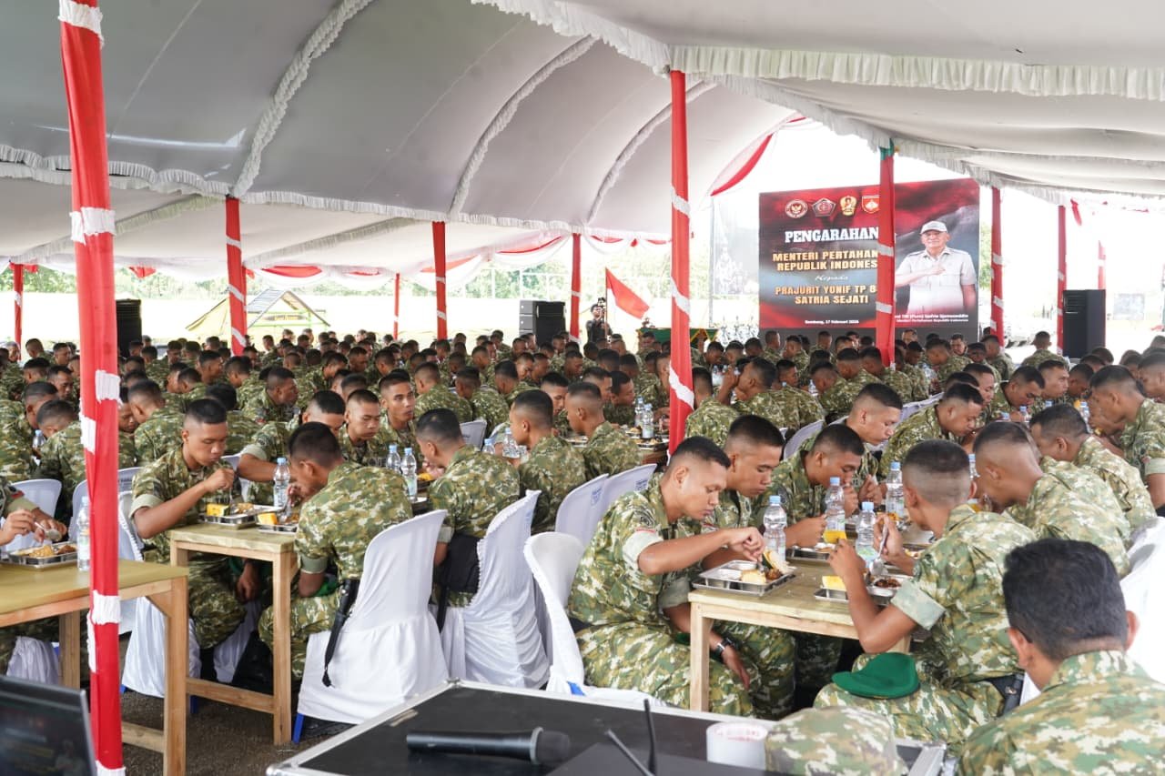 Setelah memberikan pengarahan, Menhan bersama Rombongan melaksanakan makan siang bersama seluruh prajurit.