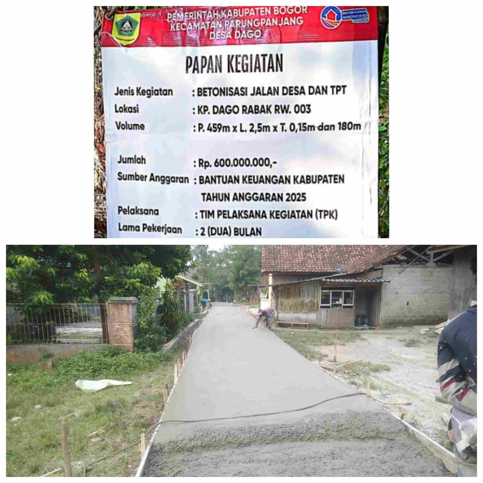Metronusa News,  BOGOR | Pemerintah Desa Dago,Kecamatan Parung Panjang,Kabupaten Bogor,Provinsi Jawa Barat, giat laksanakan pembangunan Betonisasi jalan desa dan pembangunan Tanggul Penahan Tanah ( TPT ) yang berada di RT,001,002, RW,003. Kampung Rabak Desa Dago pada Kamis 09/10/2025.