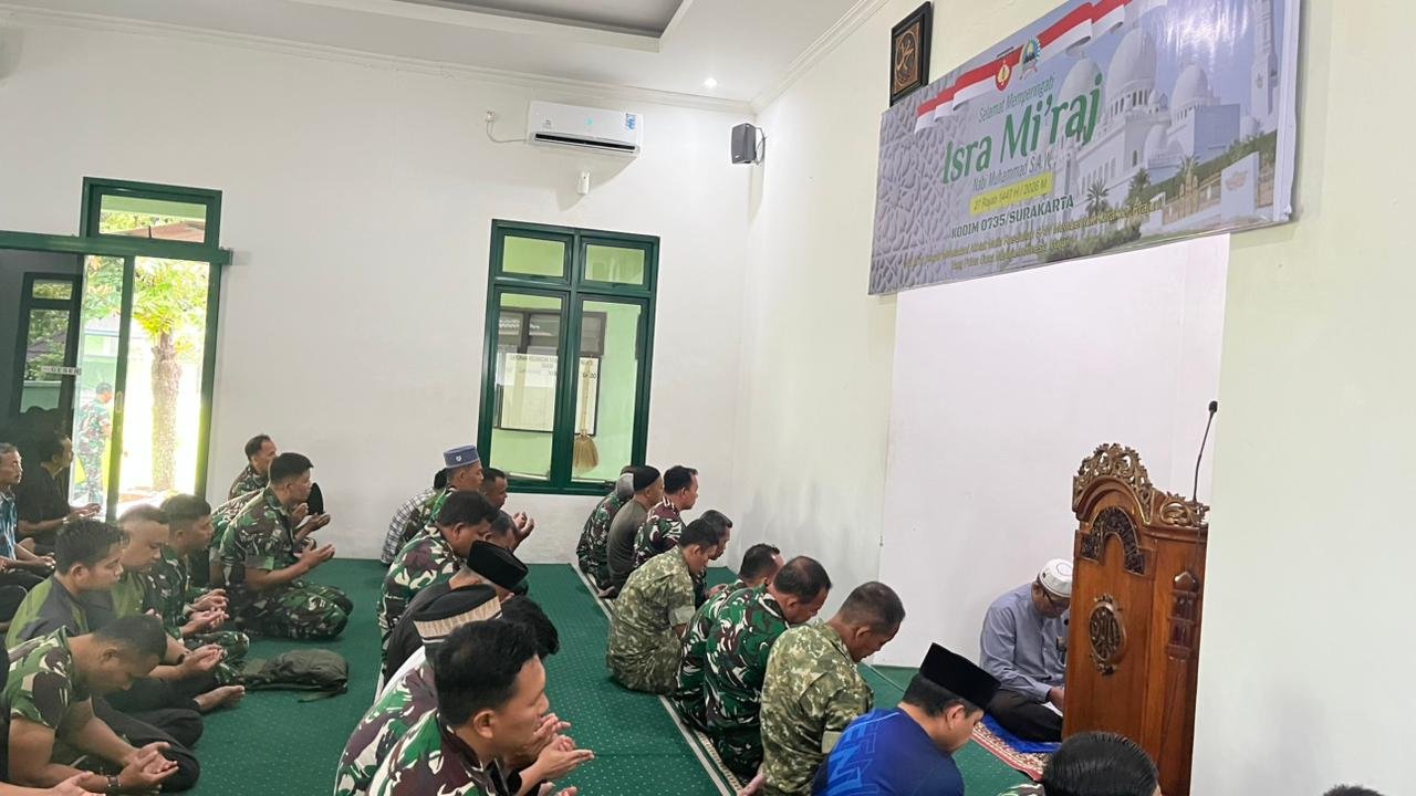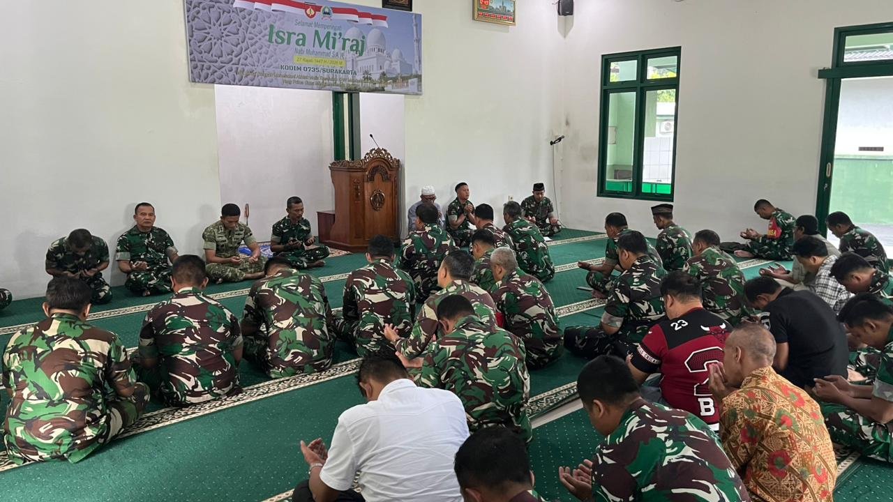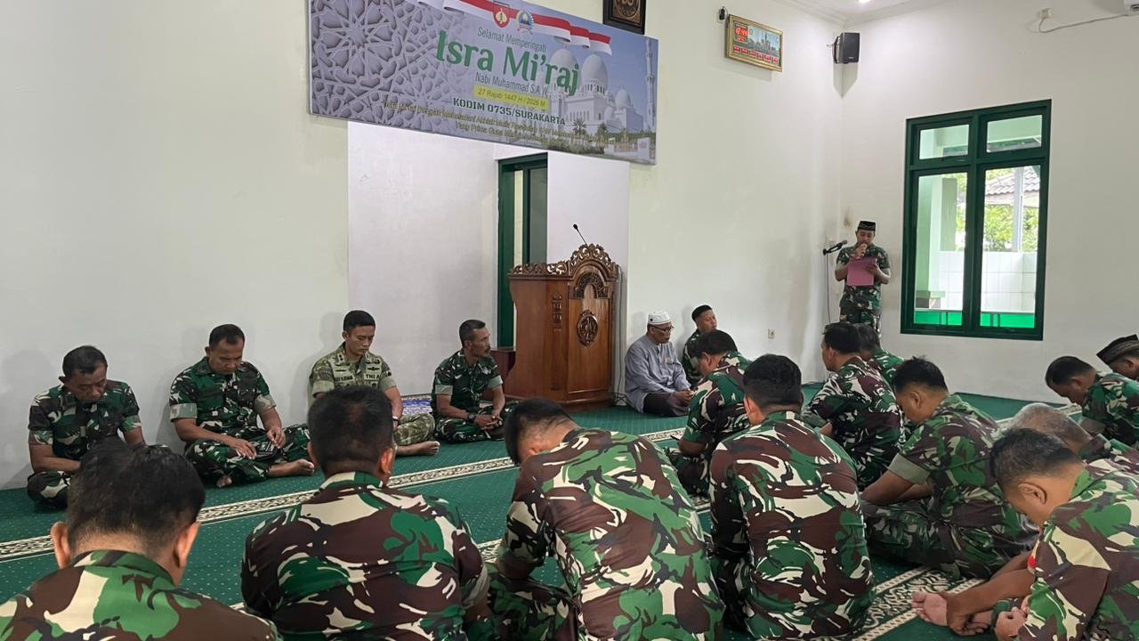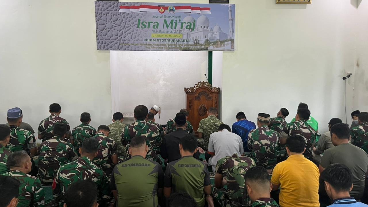 Kegiatan yang mengusung tema “Isra Mi’raj dengan meneladani akhlak mulia Rasulullah S.A.W., membentuk karakter prajurit yang prima guna menuju Indonesia maju” digelar di Masjid Al-Falaq Komplek Kodim 0735/Surakarta Jln. A Yani No.349, Kelurahan Kerten, Kecamatan Laweyan, Jum’at (23/01/2026).
