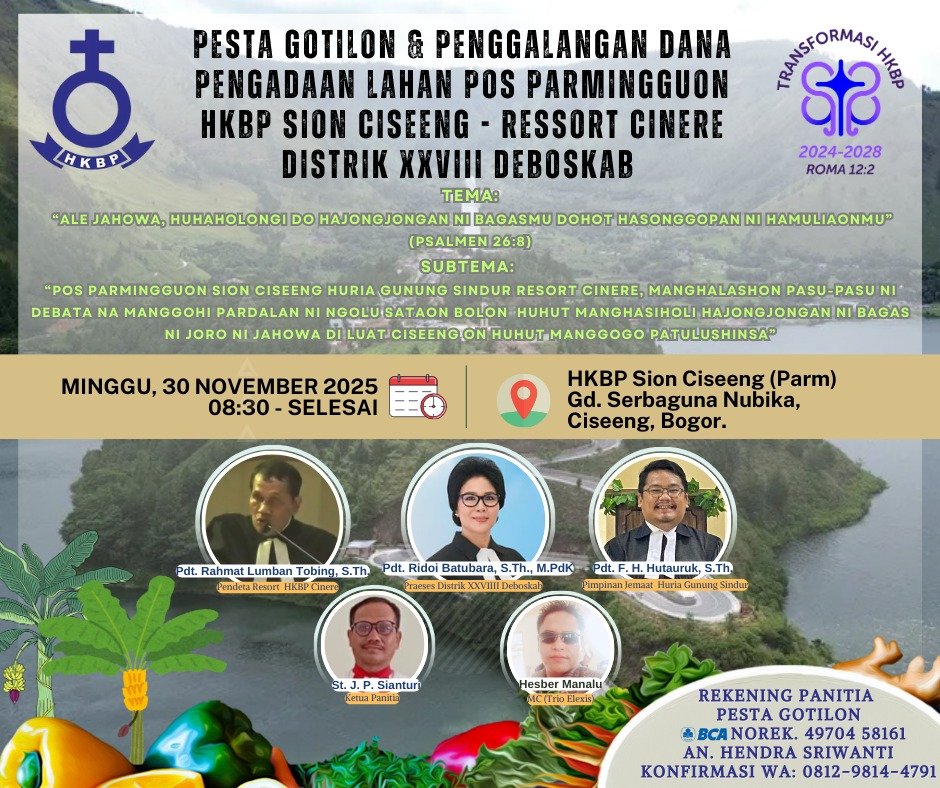 Metronusa News, Bogor | Horas Amang/Inang, HKBP Pos Parmingguon Sion Resort Cinere akan mengadakan Pesta Gotilon 2025 & Penggalangan Dana Pengadaan Lahan. Dengan TEMA: “Ale Jahowa, huhaholongi do hajongjongan ni bagasmu dohot hasonggopan ni hamuliaonmu” (psalmen 26:8).