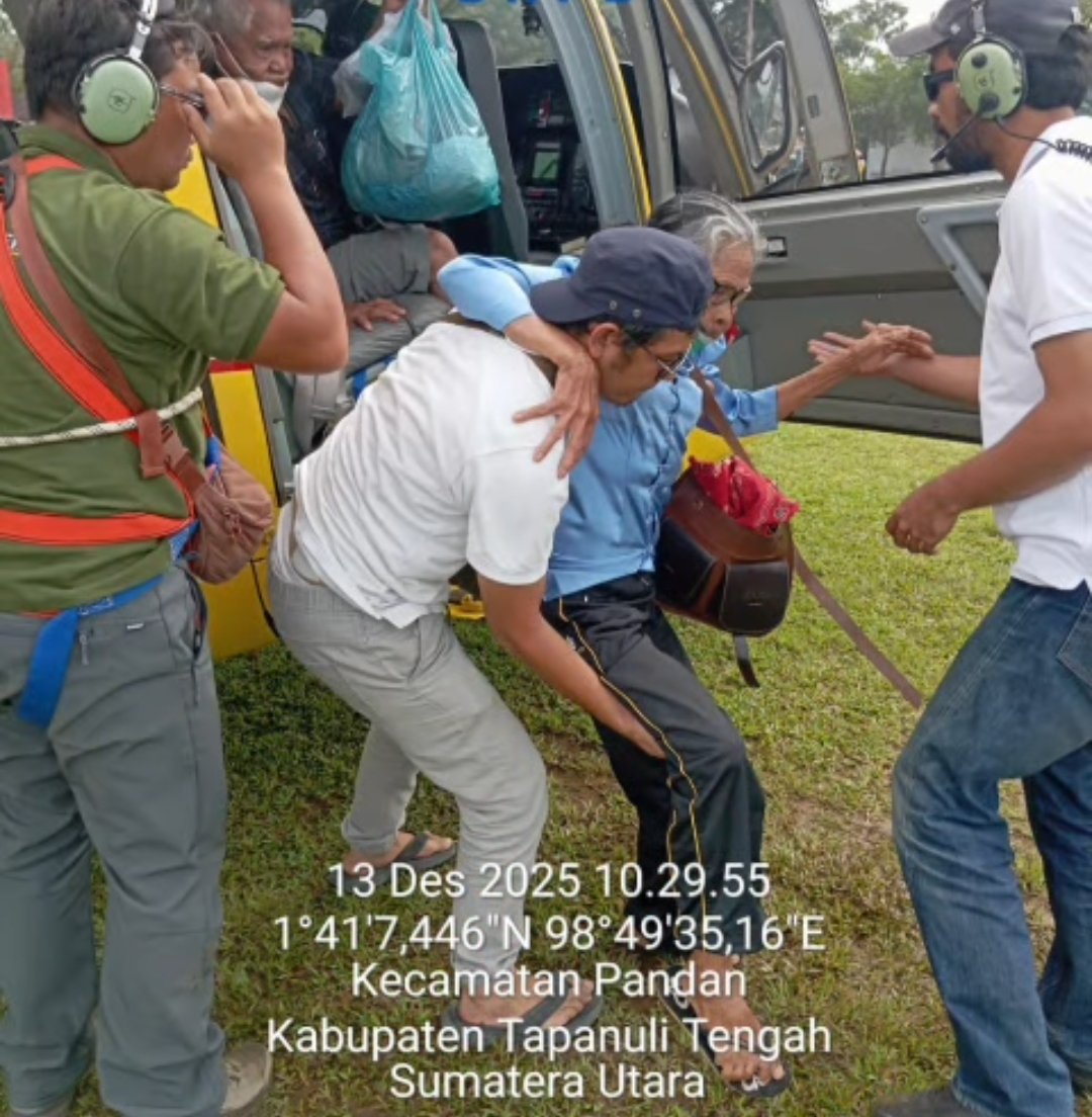 Metronusa News, TAPANULI TENGAH – Dinas Kesehatan (Dinkes) Kabupaten Tapanuli Tengah (Tapteng) bersama Tim Tanggap Darurat Bencana Alam Banjir Bandang dan Longsor Kabupaten Tapanuli Tengah kembali mengevakuasi empat warga dari Desa Sait Kalangan II, Kecamatan Tukka, yang dirujuk berobat ke RSUD Pandan menggunakan helikopter BNPB, Sabtu (13/12/2025),