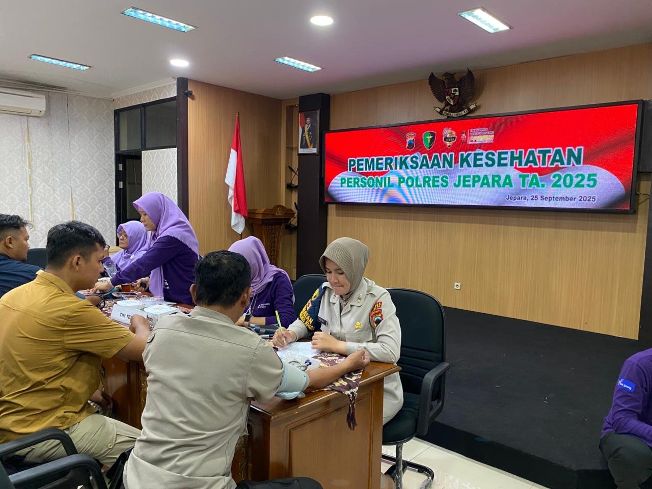 Metronusa News, Jepara | Dalam upaya menjaga kesehatan personel agar tetap prima dalam menjalankan tugas, Kepolisian Resor (Polres) Jepara melalui Seksi Dokter dan Kesehatan (Sidokkes) bekerjasama dengan Biddokkes Polda Jateng menggelar pemeriksaan kesehatan (Rikkes) berkala bagi personel Polri dan Aparatur Sipil Negara (ASN) Polri di aula Mapolres Jepara, Kamis (25/9/2025).
