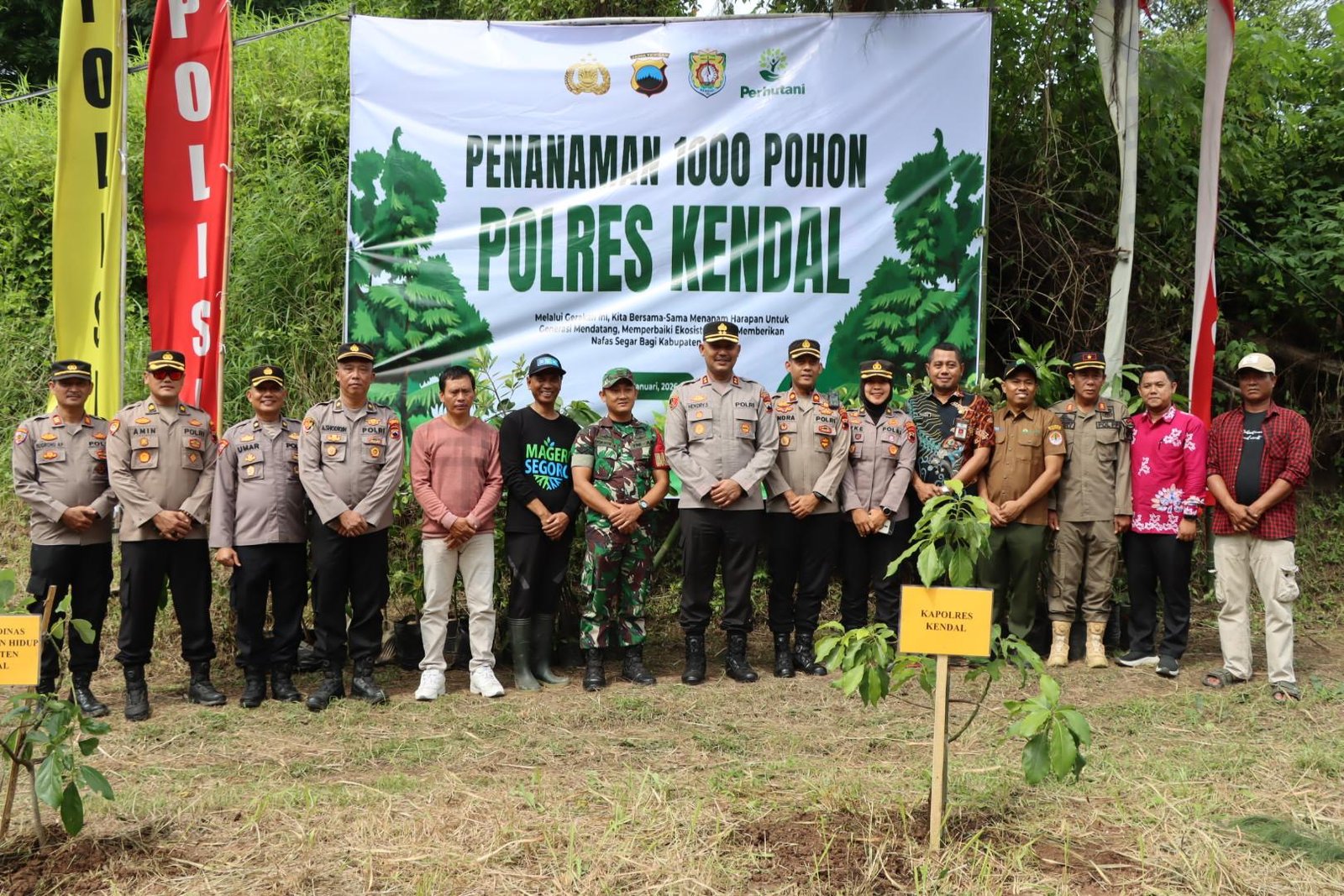 Metronusa News, Kendal, Jawa Tengah | Polres Kendal menggelar kegiatan penanaman 1.000 pohon di kawasan Kedung Pengilon, Desa Tunggulsari, Kecamatan Brangsong, Kabupaten Kendal, Selasa (13/1/2026). Kegiatan ini dipimpin langsung oleh Kapolres Kendal AKBP Hendry Susanto Sianipar dan diikuti unsur pemerintah daerah, TNI, tokoh masyarakat, serta warga setempat.
