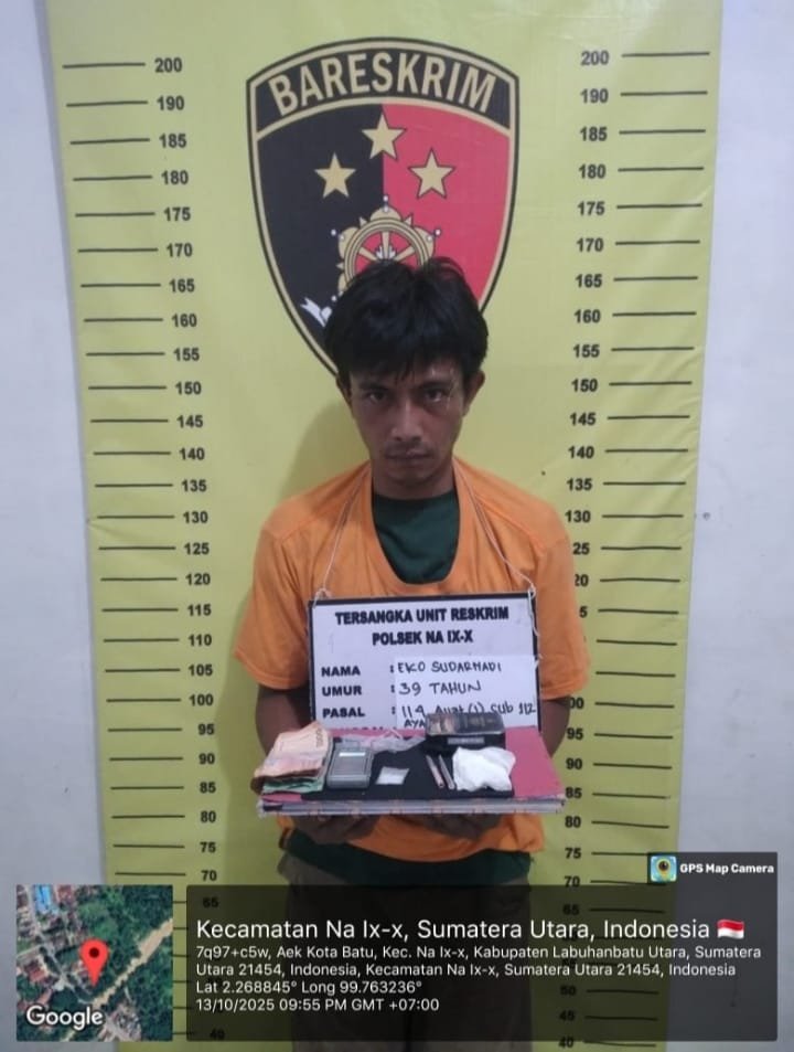 Metronusa News, Labura – Unit Reskrim Polsek Na IX-X berhasil mengamankan seorang pria berinisial ES (39) atas dugaan penyalahgunaan dan peredaran narkotika jenis sabu-sabu. Penangkapan dilakukan pada hari Senin, 13 Oktober 2025, sekira pukul 21.00 WIB, di sebuah gubuk kosong di Dusun III Gang Nenas, Desa Simpang Merbau, Kecamatan Na IX-X, Kabupaten Labuhanbatu Utara.