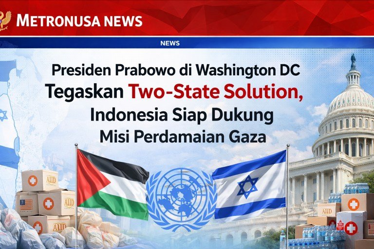 Metronusa News | Washington DC – Presiden Republik Indonesia, Prabowo Subianto, menegaskan komitmen Indonesia terhadap penyelesaian konflik Palestina–Israel melalui skema two-state solution saat memberikan keterangan pers di Washington DC, Amerika Serikat.