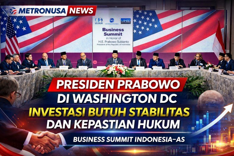 Metronusa News | Washington DC, 19 Februari 2026 — Presiden Republik Indonesia, Prabowo Subianto, menegaskan bahwa stabilitas ekonomi dan kepastian hukum merupakan kunci utama dalam mendorong pertumbuhan investasi. Pernyataan tersebut disampaikan saat menghadiri sesi roundtable dalam Business Summit yang digelar oleh U.S. Chamber of Commerce di Washington DC, Rabu (18/2/2026).