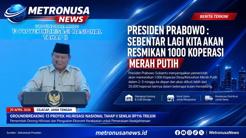 MetronusaNews.id | Cilacap, Jawa Tengah – Presiden Republik Indonesia, Prabowo Subianto, menyampaikan bahwa pemerintah akan segera meresmikan 1.000 Koperasi Desa/Kelurahan Merah Putih dalam waktu sekitar dua hingga tiga minggu ke depan. Pernyataan tersebut disampaikan saat menghadiri acara Groundbreaking 13 Proyek Hilirisasi Nasional Tahap II di Cilacap, Jawa Tengah, Rabu (29/4/2026).