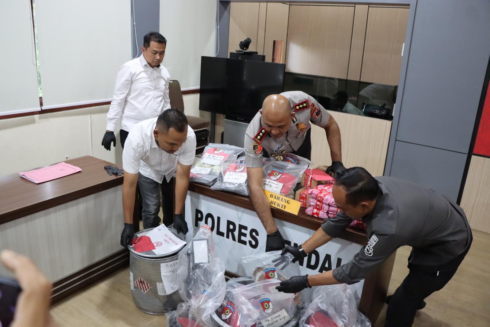 Barang bukti yang diamankan antara lain 25 paket obat petasan siap kirim seberat 1 ons, 16 paket seberat 2 ons, serta puluhan bungkus lainnya. Selain itu, polisi juga menyita 8 kilogram aluminium powder, 2,8 kilogram belerang, potassium chlorate, timbangan digital, alat tumbuk, ember, sumbu petasan, hingga satu unit telepon genggam yang digunakan untuk transaksi.