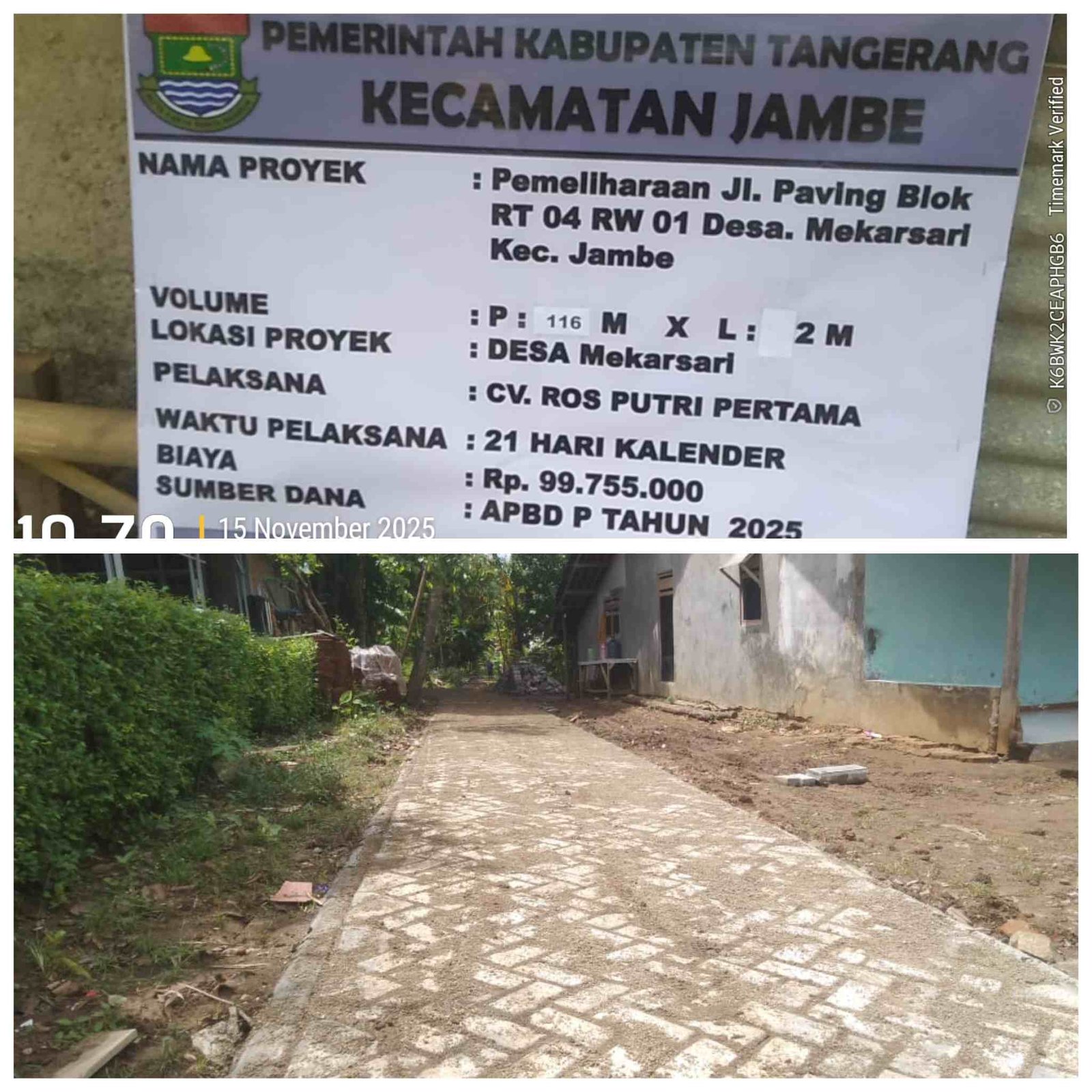 CV Ros Putri Pertama dalam melaksanakan proyek pembangunan di sini Alhamdulilah di sambut gembira oleh warga sekitar, Proyek pembangunan Pemeliharaan jalan Paving Block di biayai oleh APBD Tahun 2025 dengan Rincian pengerjaan Panjang 110 meter X 2 meter sesuai yang ada di papan proyek , CV Ros Putri Pertama juga mengucapkan banyak terima kasih Kepada Kepala Desa Mekarsari Untung Sumarhadi yang menyambut hangat sehingga bisa terlaksananya pembangunan dengan lancar dan Aman.