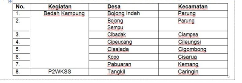Melalui RP3KP, diharapkan Kabupaten Bogor dapat melaksanakan penanganan kawasan kumuh atau Kegiatan Peningkatan Kualitas Kawasan Permukiman Kumuh dengan Luas di Bawah 10 (sepuluh) Ha, Sub Kegiatan Pelaksanaan Peremajaan Kawasan Permukiman Kumuh (Sub Sub Kegiatan Bedah Kampung dan P2WKSS), dengan rincian lokasi sasaran kegiatan sebagai berikut :