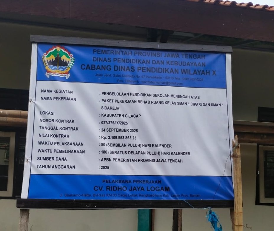 Metronusa News, CILACAP – Rehab Ruang Kelas SMAN 1 Cipari dan SMAN 1 Sidareja dengan Nilai Kontrak sebesar Rp.3.109.953.863,23 yang dikerjakan oleh CV.Ridho Jaya Logam. Yang mana diduga pekerjaan asal-asalan diduga juga 2000 genteng tidak diganti. Dugaan ini timbul setelah tim melakukan kroscek lapangan dan hasil dari pada konfirmasi.