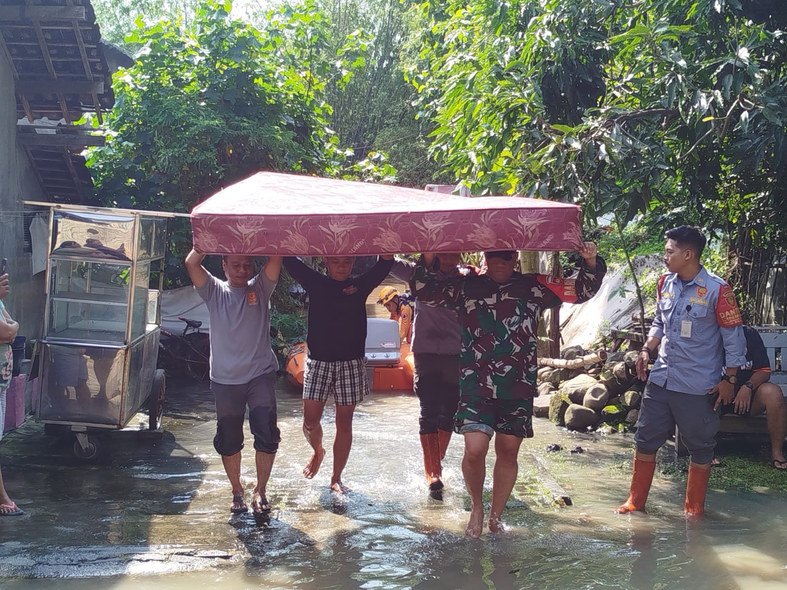 Hujan deras yang mengguyur kota Surakarta dari tadi malam mengakibatkan terjadinya luapan air bengaan Solo dan mengakibatkan banjir di beberapa titik di wilayah Kota Surakarta, air yang deras mulai mengalir memasuki area pemukiman dan jalan raya setempat. Menanggapi kondisi tersebut, Babinsa Kelurahan Jebres Serka taufik langsung merespon cepat dengan mendatangi lokasi dan segera membantu warga melakukan evakuasi barang-barang yang masih bisa diselamatkan.