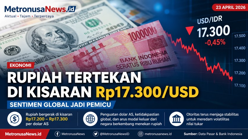 MetronusaNews.id | Jakarta – Nilai tukar rupiah terhadap dolar Amerika Serikat (AS) pada perdagangan Kamis (23/4/2026) tercatat masih berada dalam tekanan. Mata uang Garuda bergerak di kisaran Rp17.200 hingga Rp17.300 per dolar AS, mencerminkan tren pelemahan dalam beberapa waktu terakhir.