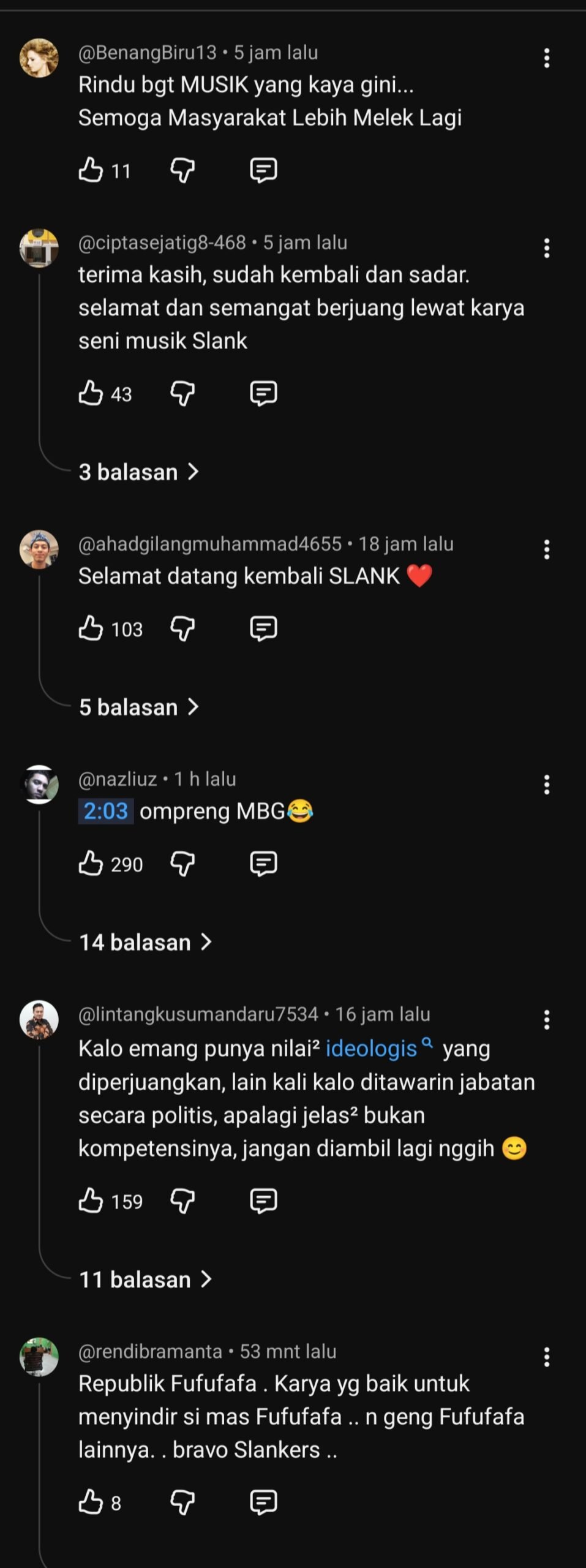 Beberapa penggemar memberikan komentar pada akun youtube @musicslank :