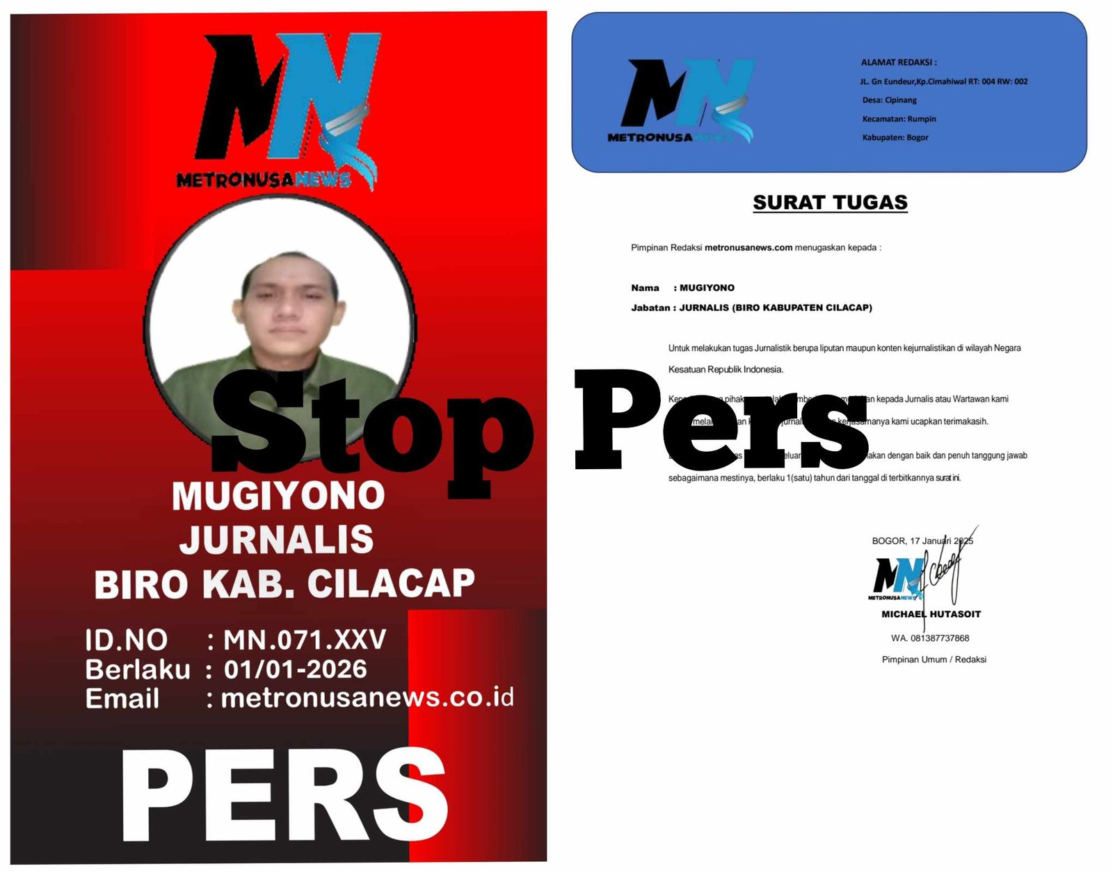 Diberitahukan kepada Pemerintah Kabupaten Cikacap dan semua dinas baik dinas tingkat provinsi jawa jawa tengah, maupun dinas tingkat kabupaten Kota Bogor serta TNI – Polri. Mulai hari ini Selasa 20/11/2025, nama ini bukan lagi anggota jurnalis Media METRONUSA NEWS :