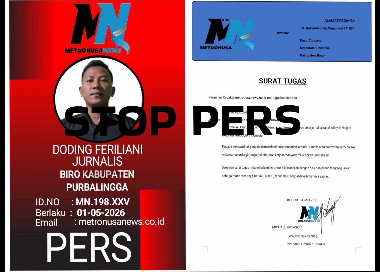 Nama tersebut di atas sejak di keluarkan keputusan hasil rapat dewan Redaksi dinyatakan di STOP PERS. Maka segala tindak tanduk kegiatan nya, bukan lagi tanggung jawab pihak Perusahaan dan Redaksi Media METRONUSA NEWS.